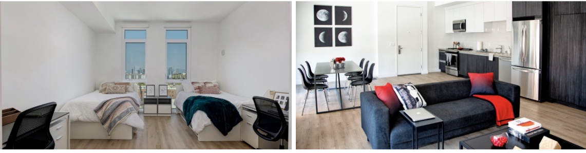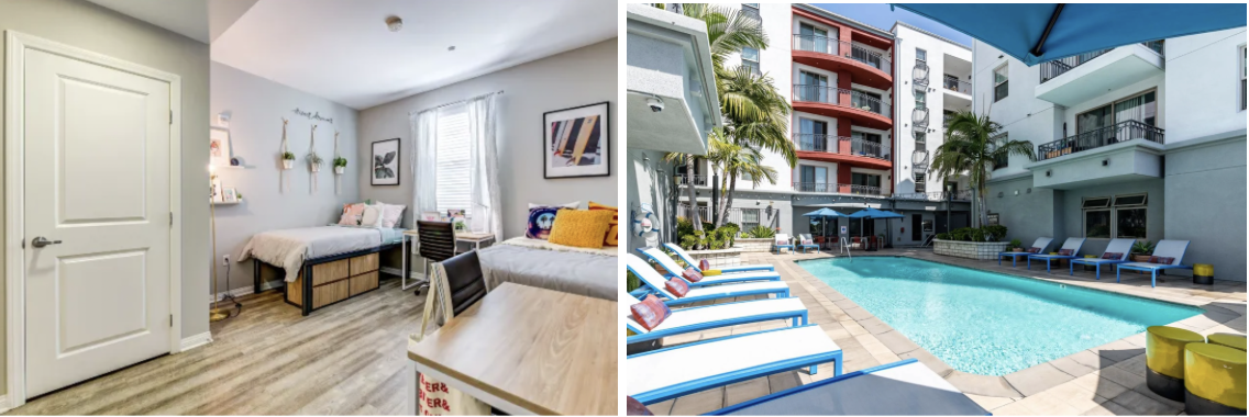 Not to be mistaken with the new Hub on Fig, The Hub Coliseum is closest to the business school and is only a 6 minute walk from Fertita Hall. If you like what the Hub has to offer but don’t want to have a delayed move in, The Hub Coliseum is a great option for you (iykyk). The Hub Coliseum is directly across the street from the USC Coliseum. This off-campus housing option features a gorgeous rooftop pool, as well as a sauna, gym, and outdoor patio. Units at The Hub come fully furnished with in-unit washers and dryers. Additionally The Hub has a parking garage and a place to store bikes. Very popular amongst business students, The Hub is generally known as one of the pricier off campus housing options.