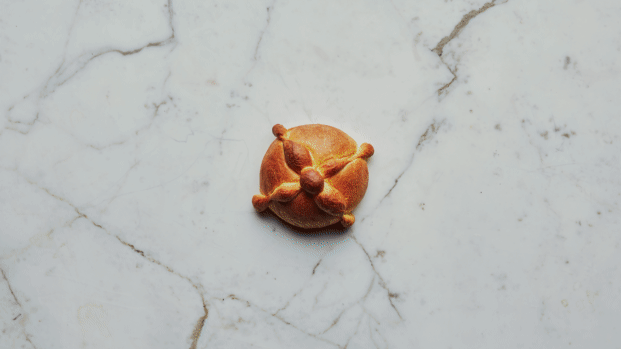 This is sweet bread with orange zest that is decorated with bone shapes and sprinkled with sugar. The bread is shaped in a circle to represent the circle or natural cycle of life. This is commonly eaten alongside a hot drink. Typically champurrado or atole.