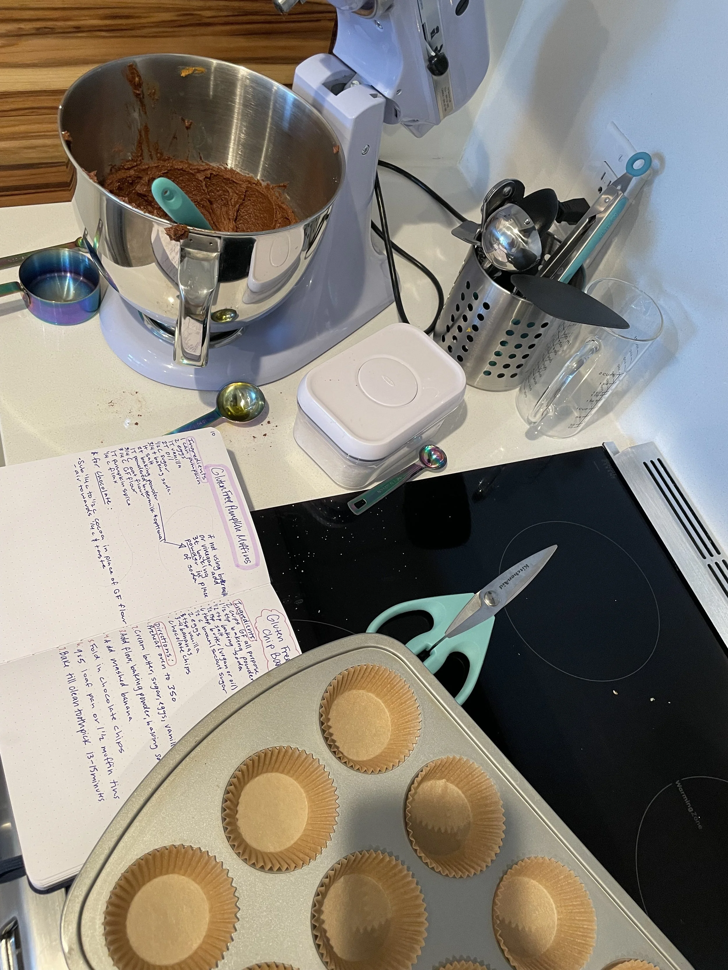 Baking is the perfect stress reliever because it engages your body, and to a certain extent your brain, completely. You can put on music, a TV show, a podcast, or an audiobook in the background and get lost in a recipe or freestyling on a treat that’s all your own. I have a notebook where I keep my mom’s recipes as well as ones I’ve found online and loved so that I don’t have to fall down an online rabbit hole looking for inspiration.