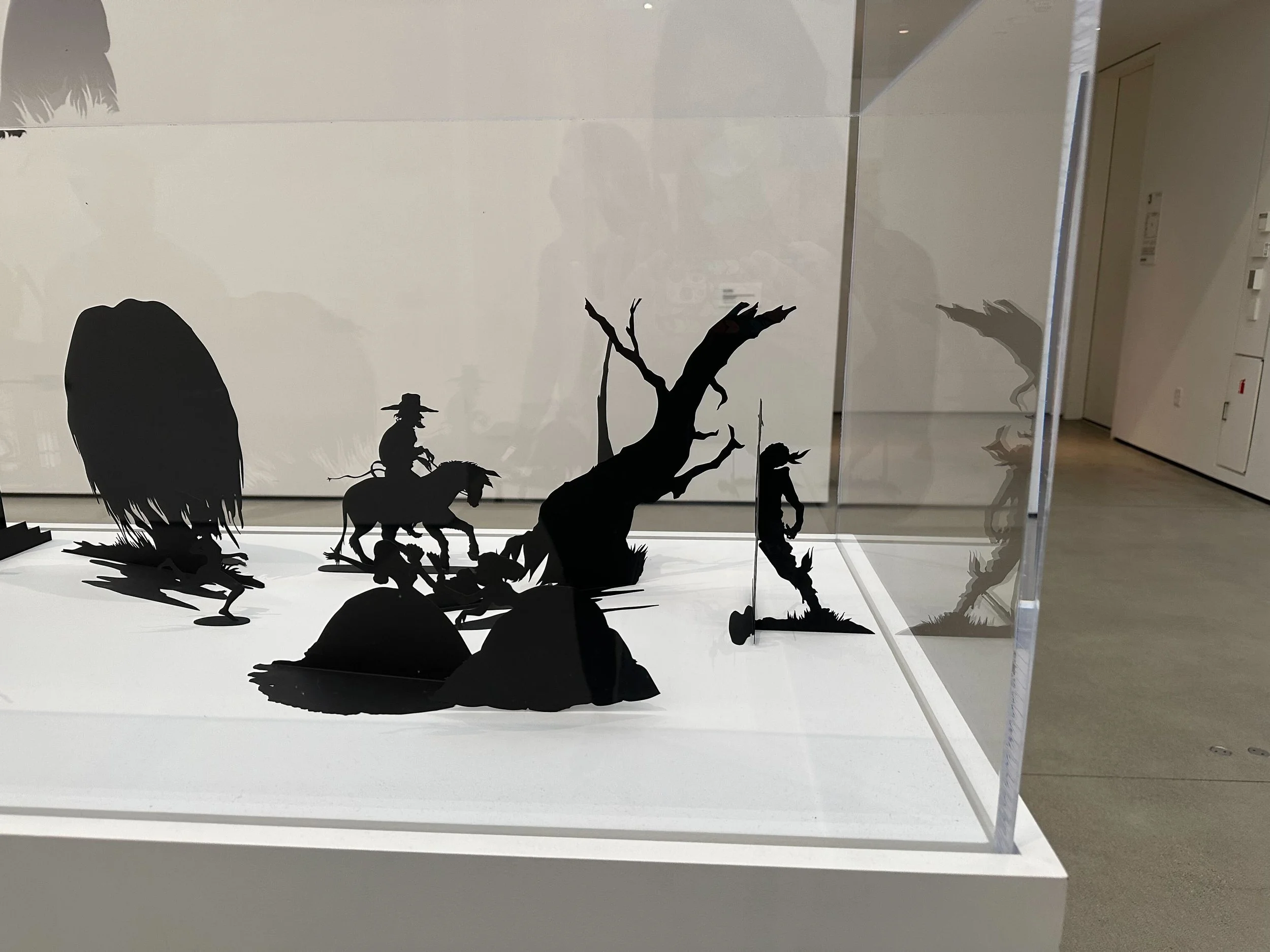 The first small room I visited was dedicated to interesting paper cut outs that seemed to tell a story. There were large, blown up versions affixed to the wall and then there was a glass case in the middle of the room showcasing the actual small scale paper cutting. These creations are by Kara Walker and were made in 1996. Called African’t, this artwork showcases pre-Civil War scenes that include characters from folk stories like Brer Rabbit pushed to extremes. The intent of the work is, “... demonstrating that the repression of history comes only at society’s peril.” Like much of the art museum, despite being created decades ago, the message of the work feels remarkably like it’s directly issuing a warning about what’s happening in America today.