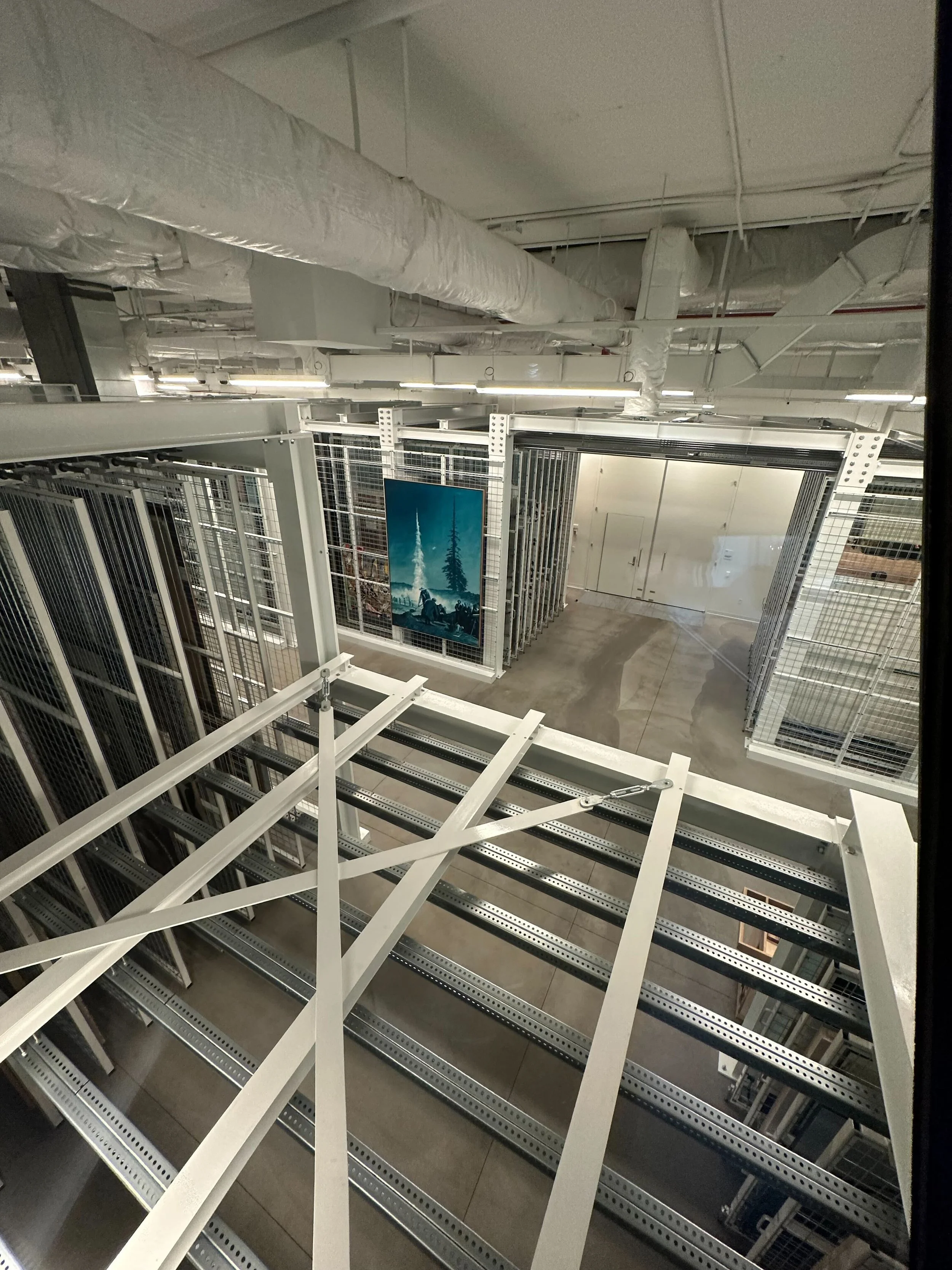 The stairs are the easiest way down (though if you need it, there’s a very cool glass tube elevator, it’s just very small so there was a considerable wait), but the annoyance of having to navigate 3 flights of stairs is abated by the hidden gems inside. As you wander down the stairs, you’re given access to windows that look straight out of an aquarium that let you peer in on the museum’s warehouse style archive where the paintings that aren’t on display are housed in contraptions that look straight out of the doors scene in Monsters Inc. If you’re lucky, you’ll even get a glimpse of a museum curator walking through the concrete space trying not to make awkward eye contact with you. It’s incredibly fun to get a tiny glimpse of the “behind the scenes” area and made me wish I could take a tour of these secret space.