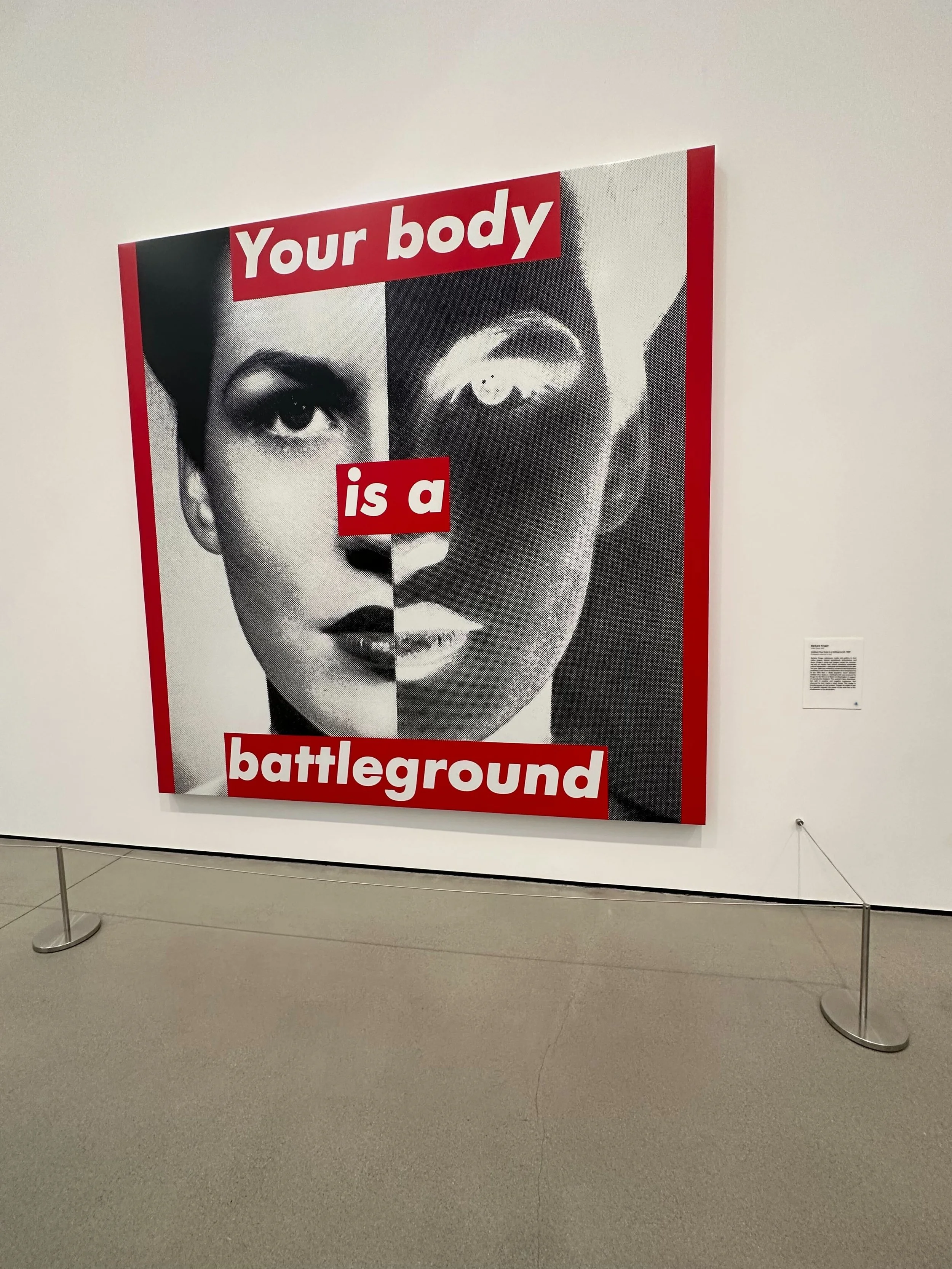 Another installation that felt incredibly, painfully resonant to the present moment was the massive canvas of Barbra Kruger’s untitled work that has “Your body is a battleground” written over a woman’s face rendered in a pop art vein. Created in 1989, the informational plaque discussed how this artwork came from a time where women’s rights were at risk, similar to the tragic rollbacks of abortion rights we’re seeing today. “The year 1989 was marked by numerous demonstrations protesting a new wave of antiabortion laws chipping away at the 1973 Roe v. Wade Supreme Court decision.” It’s a piece that’s lingered in my mind since the days I first saw it, and it was a painful reminder that history often repeats itself over and over and over.
