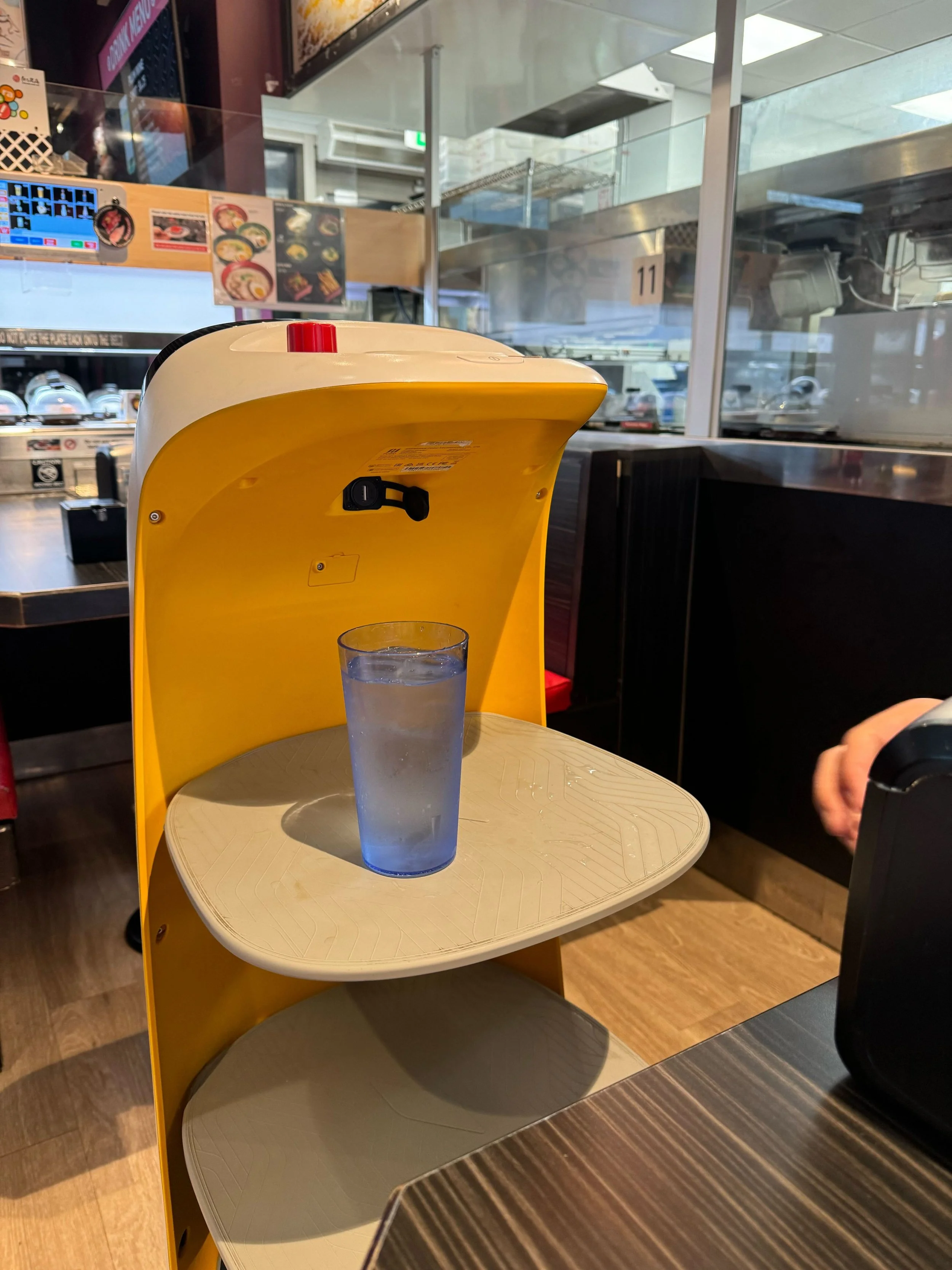 As for drinks, there was a plethora of teas, juices, and soda to choose from. We just stuck with water, but that was still far from a boring choice! Branden told me they delivered it in a “special way,” and I was confused until I turned around and spotted a robot holding our drinks. Even though the restaurant has human staff, the robots deliver the beverages. I thought that was so cool.