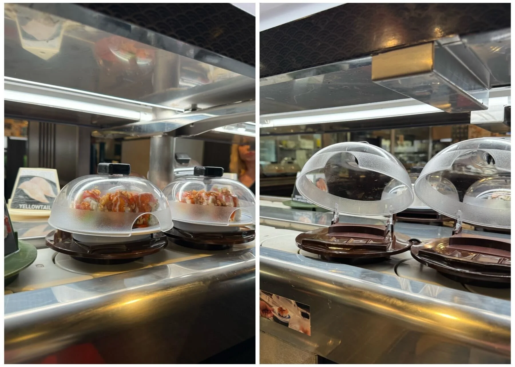 I’m extremely glad that Branden, who is familiar with revolving sushi, went with me because I would’ve had no clue what to do on my own. Each dish on the belt is kept under a plastic dome that has to be removed before you can take the plate. It sounds simple, but you have to press a specific part of the container while simultaneously holding onto the plate to get it to open, and it was much harder than it looked. He was experienced with how to take the food out of its container and onto the table, which took me a few tries to understand. I wouldn’t consider myself anywhere close to an expert now, but I was able to do it without help one or two times before we left, so I consider that a win.