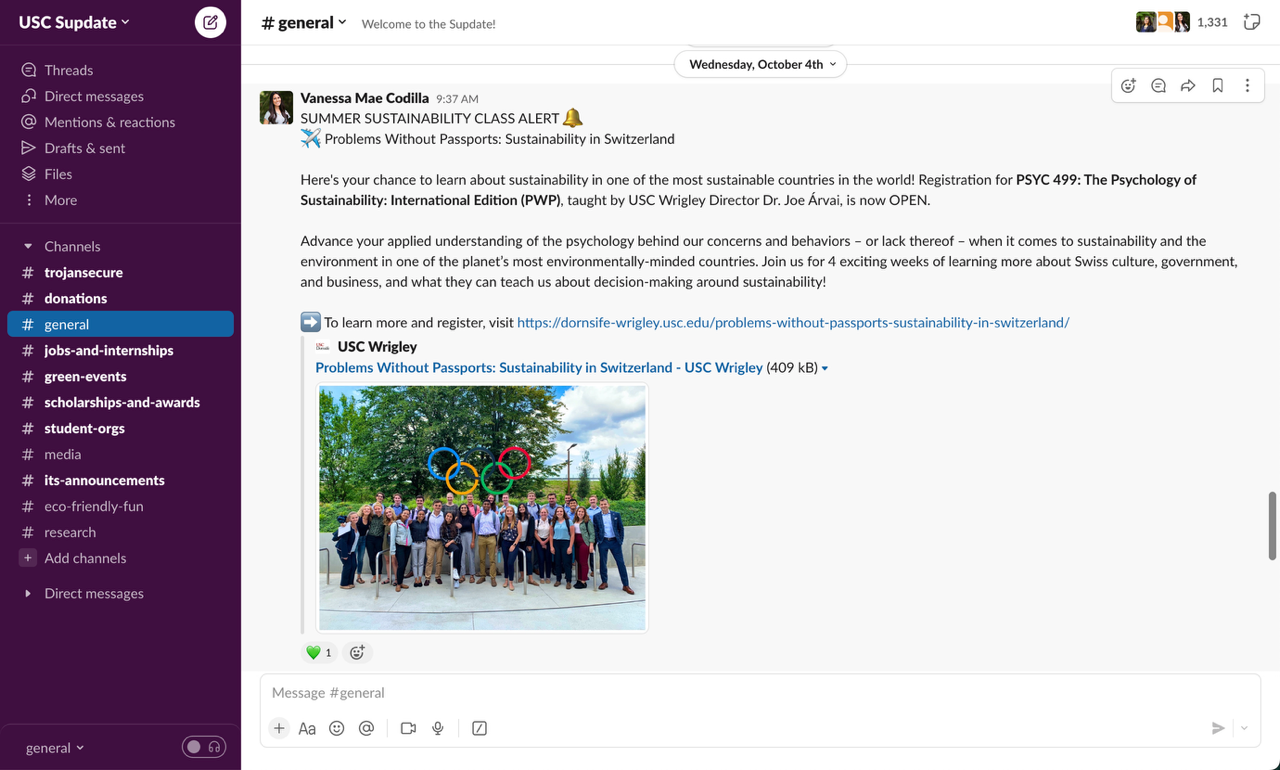 Stay up-to-date on sustainability-focused events, organizations, and opportunities around campus with the “Supdate” Slack space. Plus, look no further to find jobs, internships, research, and volunteer opportunities in up-and-coming environmentalist fields. So much environmental work happens at USC that it can be hard to find it all — until now!