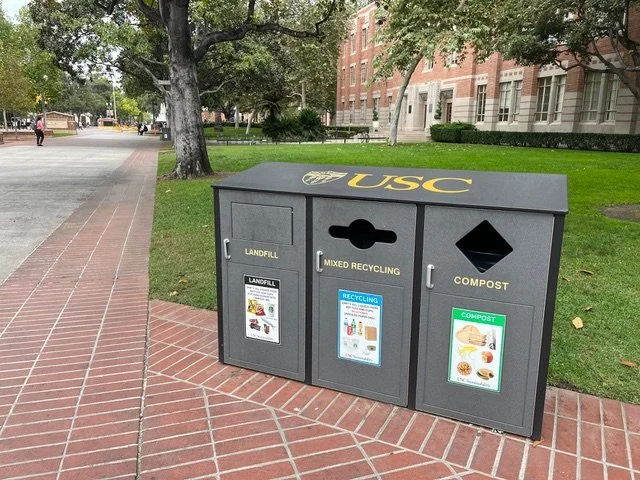 Lower your carbon footprint by recycling and composting your waste! USC provides labeled multi-stream bins around campus for recycling (bottles/cans/paper/plastic), compost (food/napkins), and landfill waste. Plus, students in USC Housing buildings — and most of the University Park neighborhood — can recycle from home. Know what goes where, and sort before you throw!