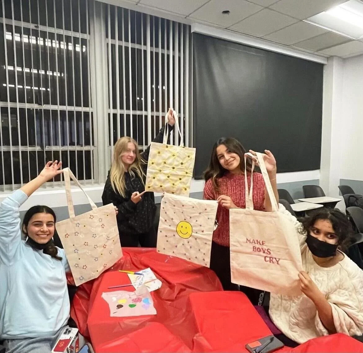 Rumaisa: Last semester, we had this tote bag painting social that we combined with our educational presentation. We had a team who was leading a conversation on managing stress and things of that nature, and we combined that with the painting. We’ve done lots of cool events in the past. For example, last spring we had a yoga social which was really cool. We also had a self defense fundraiser where one of the self defense coaches came in and gave us a little class with some tips. We did that in contribution to raising money for a Domestic Violence Awareness fund.