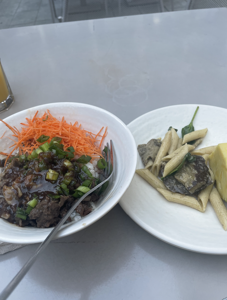 Dinner at EVK! After a long day of class, I came to EVK in hopes of finding a relatively yummy meal. I did not find it that day. The pasta had a weird flavor, and the mushrooms did not taste like mushrooms. The Korean beef bowl, however, was relatively tasty, if not a bit dry. The fruit, however, saved this meal, as the pineapple was incredibly fresh and yummy.