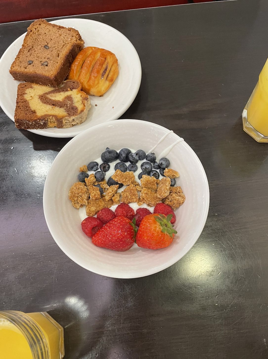 Breakfast at the Village! I wasn’t too hungry that day, but I made myself a healthy and tasty yogurt bowl with fruit and granola. I also grabbed some pastries and bread alongside my yogurt. The pastries were alright, if a bit dry, but my yogurt was mouth-watering and delicious! The fruit was very fresh, and I enjoyed my breakfast thoroughly that day.