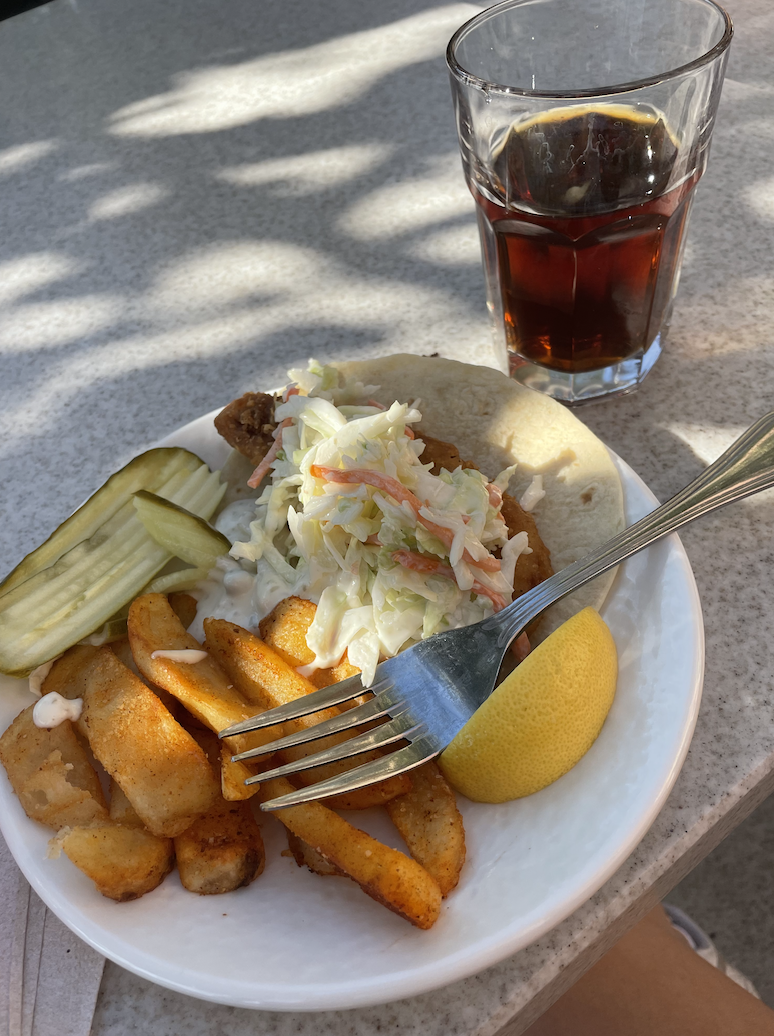 Dinner at the Village! Fish and chips were served that day, alongside fries and pickles. The fish had little flavor and day, and was not too appetizing. The coleslaw was a little warm too. The fries and pickles, however, were delicious! The fries were crispy and the pickles were just the right amount of sourness.